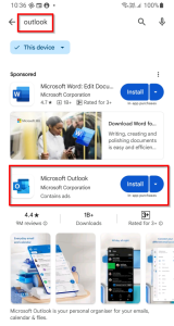 1. Open the play store > Search for and install Microsoft Outlook